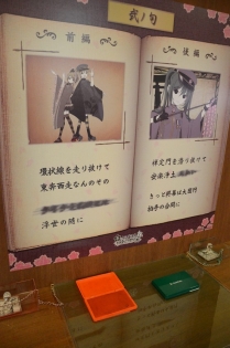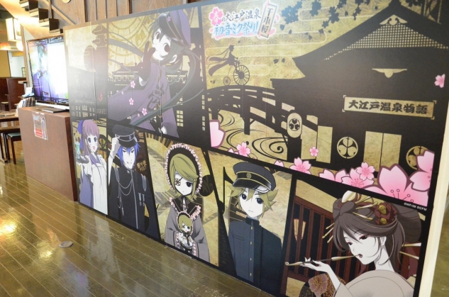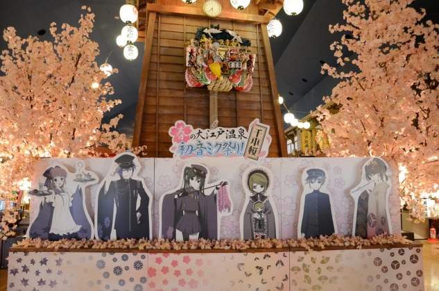 抵達「大江戶溫泉物語」,光是入口的大型千本櫻看板布置就令人興奮不已。通過入口之後,初音、鏡音雙子、大姊大哥的服裝擺飾隨即映入眼簾,緊接在後面的是紀念品專區,除了販售相關商品之外也播放著千本櫻的 PV,在櫃檯完成登記後正式踏入會館的瞬間,那裡完完全全就是千本櫻的世界。
