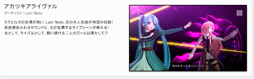 此外目前公布了即將收錄在遊戲中、包含了前幾作的知名樂曲在內的39首歌曲之外,也將對應DLC下載的方式追加目前受歡迎的人氣歌曲來添增遊戲耐玩度。